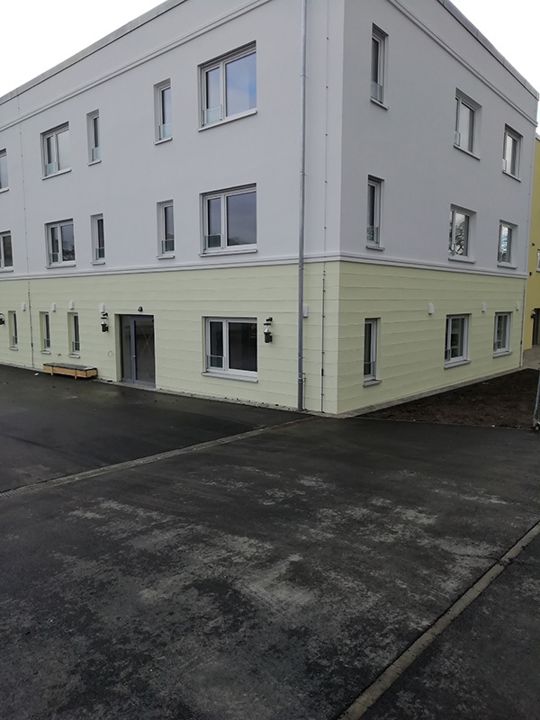 Mit der „Wohnanlage am Wald“ entstand am Würzburger Heuchelhof ein zukunftsweisendes Projekt für barrierefreies Wohnen. Bauherr war die Stiftung Wohnstätten für Menschen mit Behinderung, die gemeinsam mit dem Verein für Menschen mit Körper- und Mehrfachbehinderung eine moderne Wohn- und Betreuungseinrichtung für 24 Bewohnerinnen und Bewohner realisierte. Die neue Wohnanlage ist speziell für Erwachsene mit einer Körper- oder Mehrfachbehinderung konzipiert, die dauerhaft oder zeitweise auf einen Rollstuhl angewiesen sind. Neben den Wohnbereichen bietet das Gebäude eine integrierte Tagesförderstätte, die es ermöglicht, Betreuung, Therapie und Alltag in einem geschützten Umfeld miteinander zu verbinden.